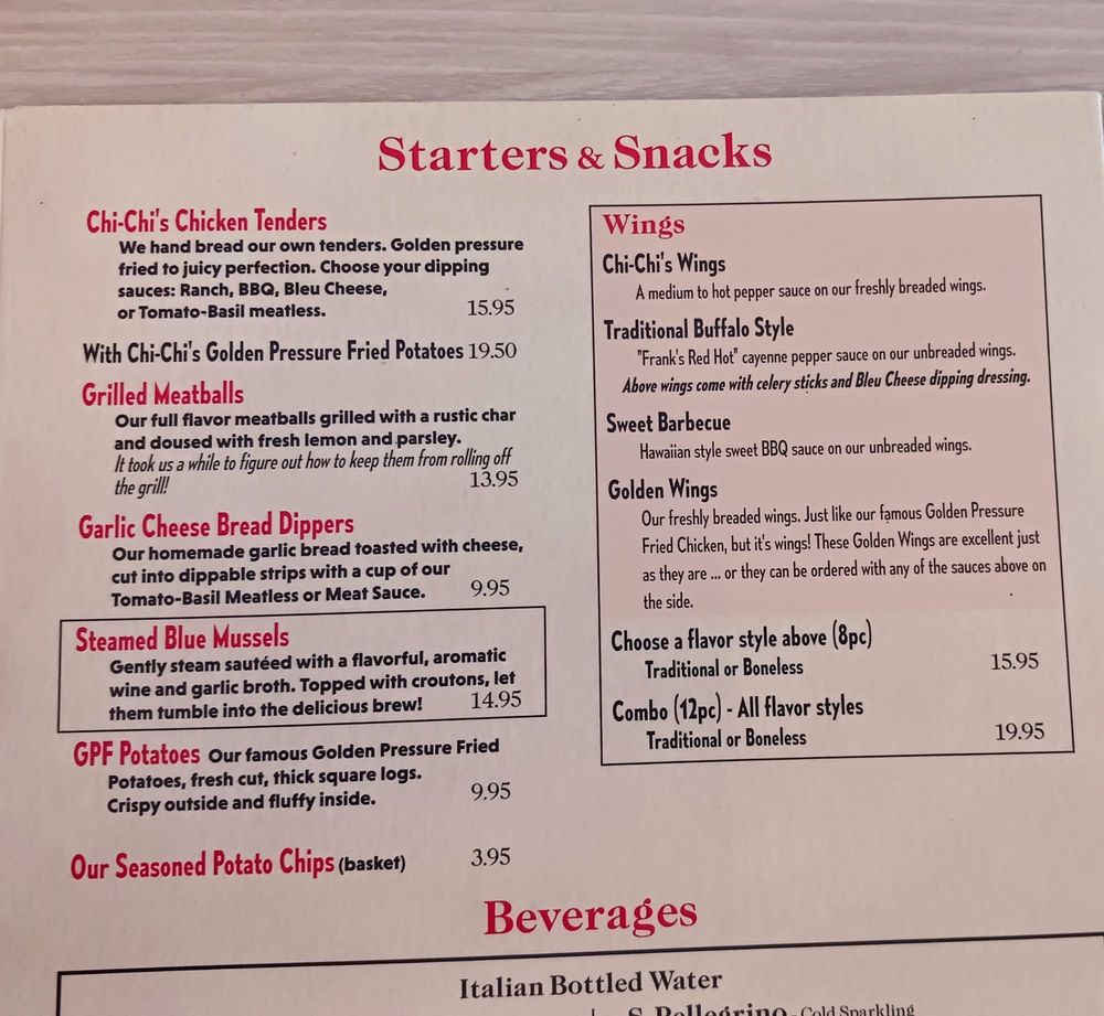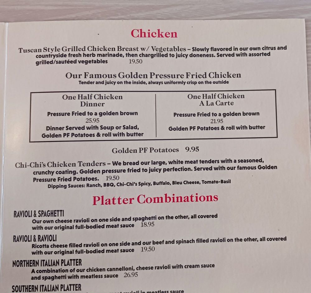 Tender and juicy on the inside, always uniformly crisp on the outside. Chicken dinner: pressure fried to a golden brown, dinner served with soup or salad, golden fried potatoes & roll with butter. Chicken a LA carte: pressure fried to a golden brown; golden fried potatoes & roll with butter